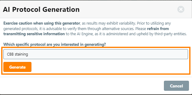 In the pop-up window, enter a prompt describing the type of protocol you wish to create and click the Generate button.
