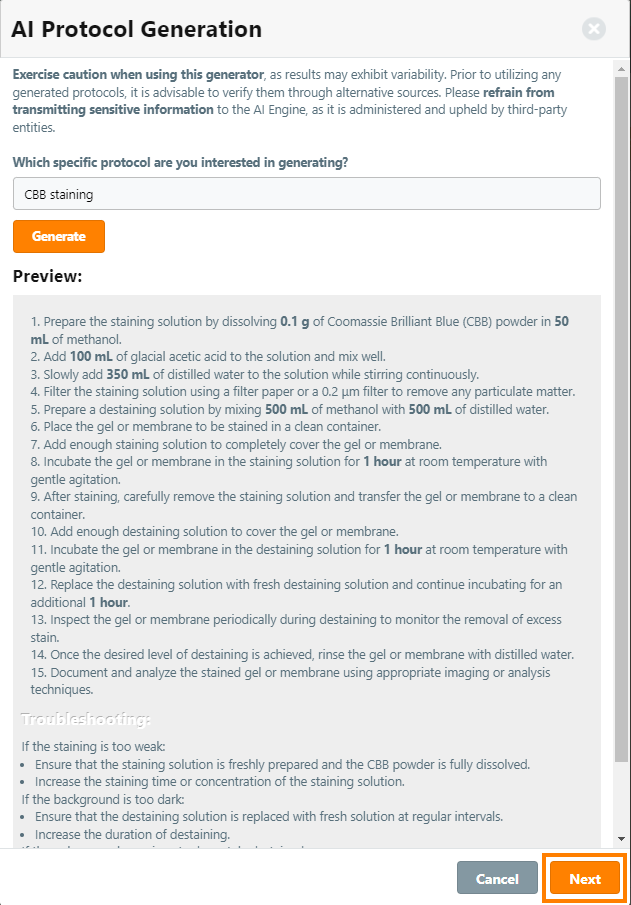 A preview of the protocol is displayed in the window for review. Users can adjust the protocol prompt and click the Generate button to rewrite the protocol. To accept the preview and convert it into a draft protocol, click the Next button at the bottom of the window.