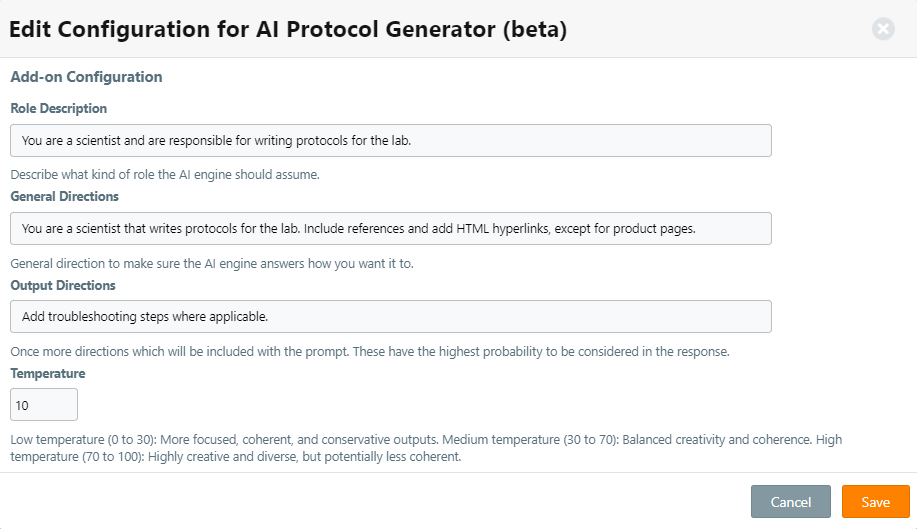 Users can configure the AI Protocol Generator's prompts to tailor responses for to their lab's standards and subject matter. Note: the add-on is preconfigured with hardcoded instructions to ensure that the formatting complements eLabProtocol's existing structure and feature set.