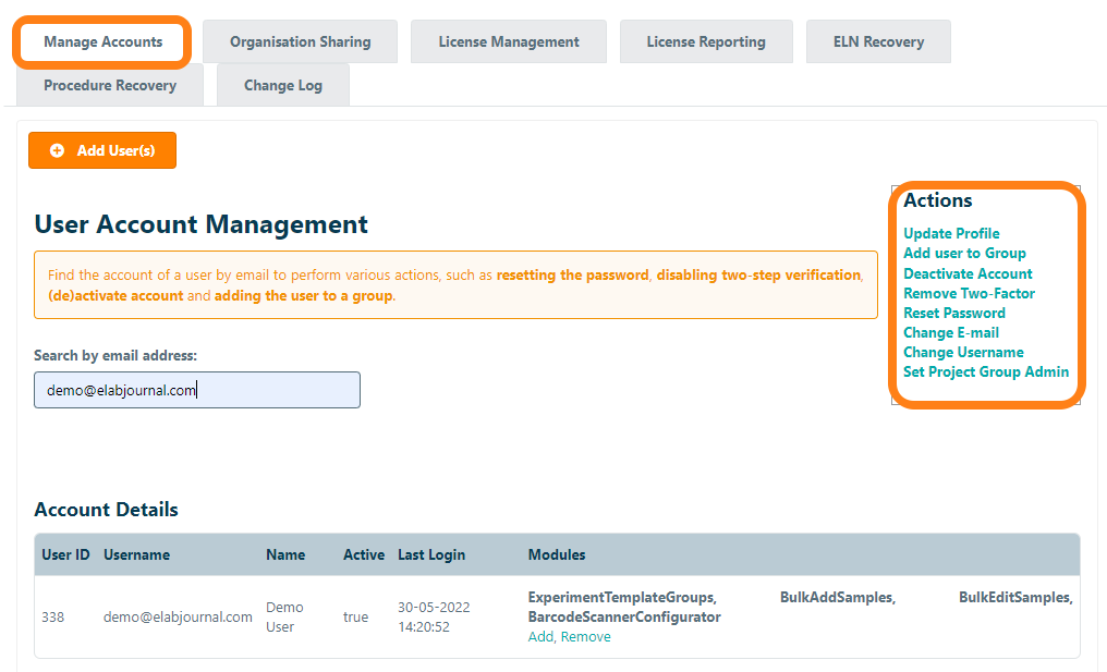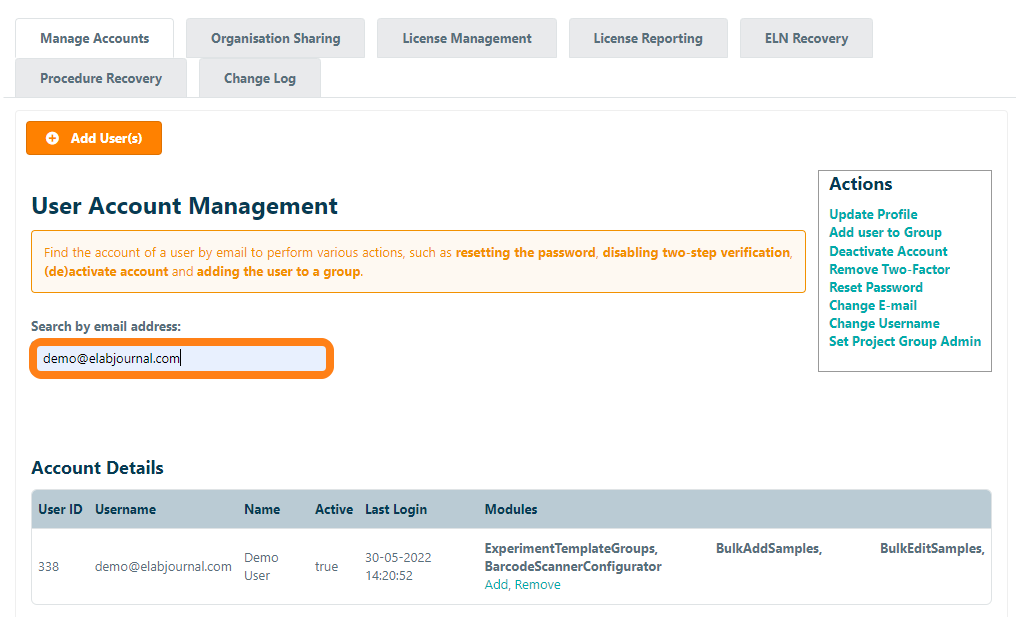 To manage users in the organisation, navigate to the Organisation Admin panel and open the User Management tab. Find the account of a user by entering the corresponding email address. The following account information of the user in your organisation will be shown: