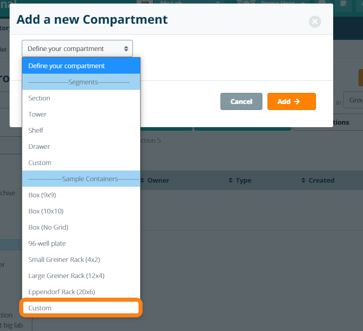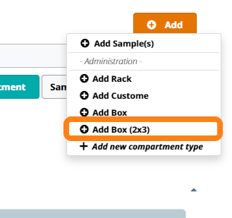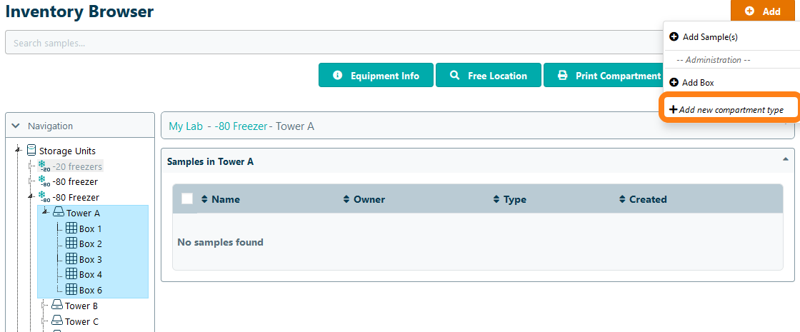 In case the compartment of your preference is not present as an option when adding a compartment, you can define a new compartment type template. Open the Inventory Browser and select the storage unit or compartment to which you want to add a new compartment type. Click on the Add button and choose the option Add new compartment type.