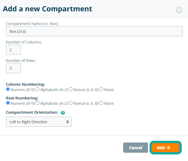 Here you can name the template, choose the size, numbering and orientation of the compartment. Click Add to add this new compartment type.