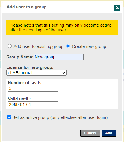 Click Add to create the group and add this user to this group. In case this user is not yet a member of any group, we recommend to set this group as the active group.