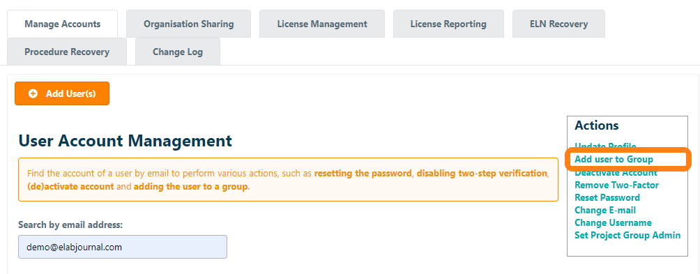 To add a user to an existing group, navigate to Manage Accounts in the Organisation Admin panel. Find the relevant account by entering the email address and click Add user to Group.