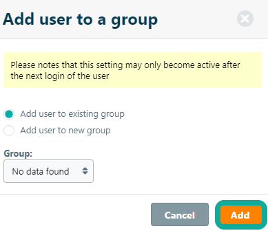 Select the group within the organisation to which the user should be added and click Add. Optionally, set the selected group as the Active Group for a user to enforce that by the new login the user is automatically working in this group.