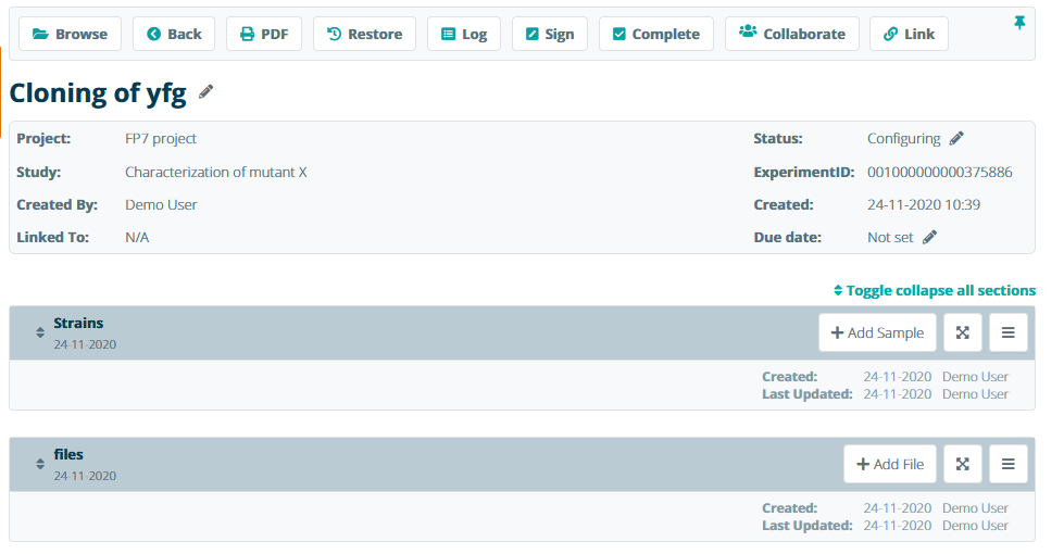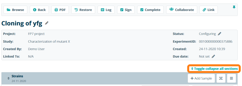To receive a condensed overview of an experiment, use the Toggle collapse all sections.