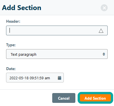 Enter a section title and select the type of section you want to add. You can choose between sections to add a text, a protocol template, samples, images, files, and drawings. Additional section types may be available when certain Marketplace add-ons have been installed, including an Excel spreadsheet or chemical structure sketchpad. You can change the section date to keep sections in chronological order. Note: in compliance to GLP, a timestamp is recorded when the section has been added and is displayed in the section footer.