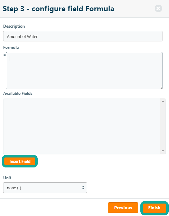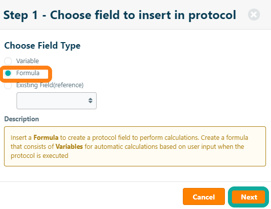 On the next window, the user will define the formula that determines the field's output in the Formula field. Users can select any variables that have been created in the protocol and click the Insert Field button to insert the variable into the Formula field. Alternatively, you can manually enter a variable by placing the variable name between curly brackets (i.e. {VARIABLE DESCRIPTION} ).