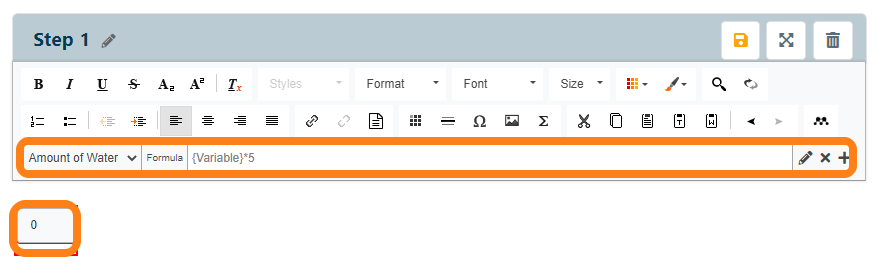 Once the formula has been defined, click Finish to add it to the protocol. When the value of a variable that is used in a formula is changed, the formula will dynamically update to reflect the new input from that variable. When selecting the formula in the protocol when editing the section, the formula will become active and will be displayed in the formula editor bar.