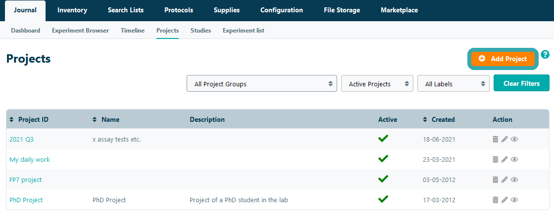 To create a new project, navigate to either the Experiment Browser or the Projects page under the Journal tab and click on the Add Project button.