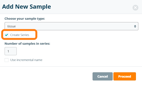 Sample series creation follows the same steps as adding an individual sample; in the pop-up window for adding a new sample, check the Create Series option.