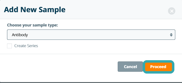 In the pop-up window, you can select the type of sample you want to store. Note that the Sample Types available for each lab can be easily be configured according to the lab requirements.