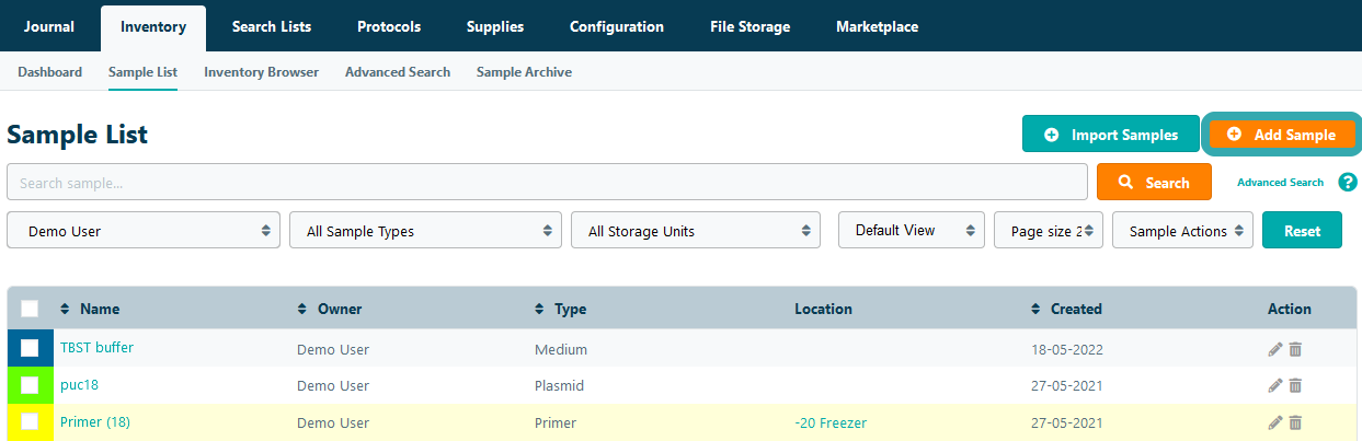 To store a new sample in to the lab's inventory, navigate to the Sample List page under the Inventory tab and click the Add button. Note that you should first define a Storage Unit and a Sample Type before adding a sample. In case, sample names should be auto-generated, you can additionally configure this in the Sample Type settings