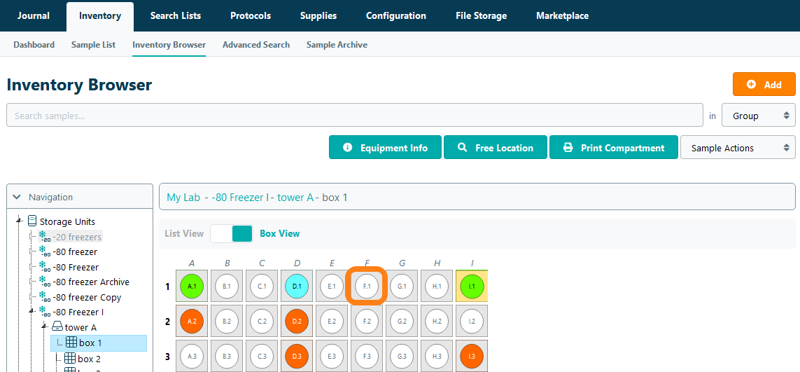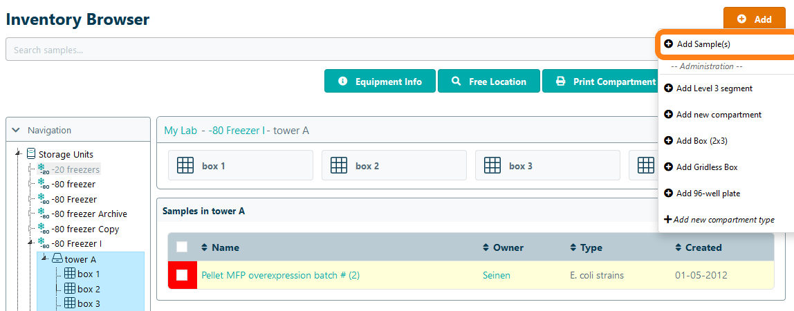 To add samples to compartments without a grid (e.g. a drawer or a tower), click the Add button in the Inventory Browser and choose the Add Sample option.