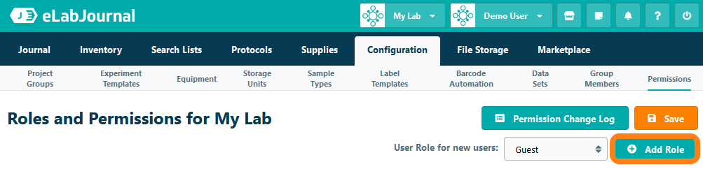 Each group has two default user roles: the Administrator and the Normal user role. To customize a user's permissions, you can add user roles and define permissions for each role according to the lab's requirements. Some examples of possible roles are lab manager, PI, trial manager, student, guest or scientist. In Configuration – Permissions, you can add a new user role by clicking Add Role.