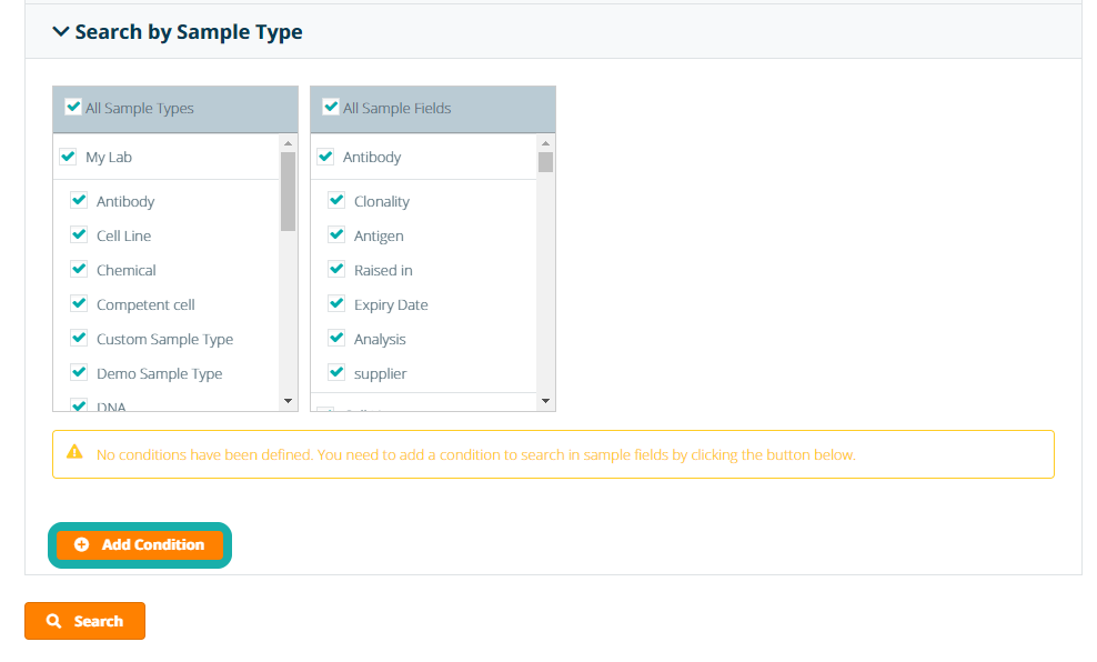 To find samples based on information in the sample specification fields, you can add search conditions by Sample Type. Select the relevant sample type(s) and/or field(s) in which you want to search from the checklists and click Add Condition.