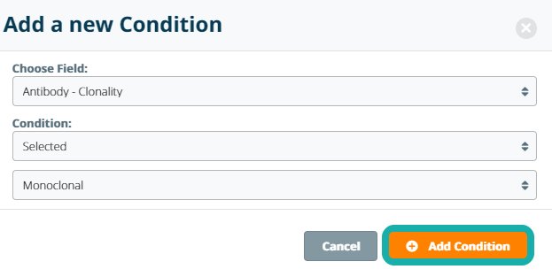 In the pop-up window, select the search condition and click Add Condition. Repeat these steps to add additional search criteria to your query.