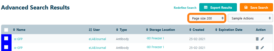 To increase the page size up to 200 samples select Page size 200 in the drop-down menu.