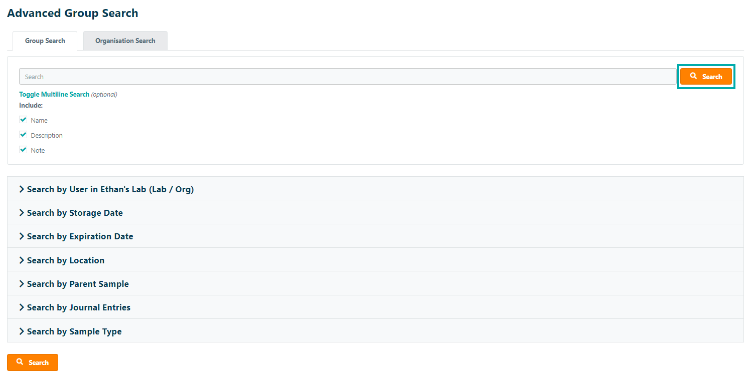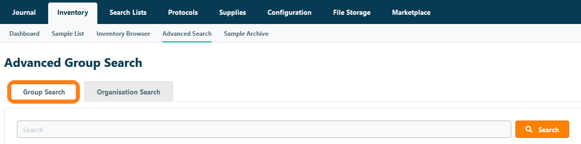 You can use the Advanced Sample Search to find samples by specific search conditions and to export sample information from the inventory. To begin a search, navigate to the Advanced Search page under the Inventory tab. The Advanced Search looks for samples in the users active group by default; additionally, there is also the organization search option to find shared samples across every group in the entire organization.