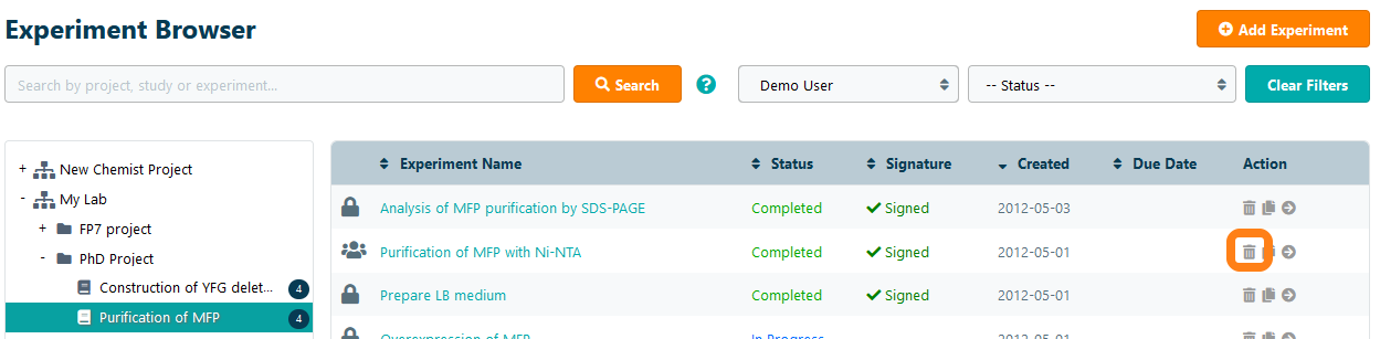You can archive an experiment to remove it from the electronic lab notebook. Find the experiment you want to remove in either the Experiment Browser or Experiment List and click the Archive icon.