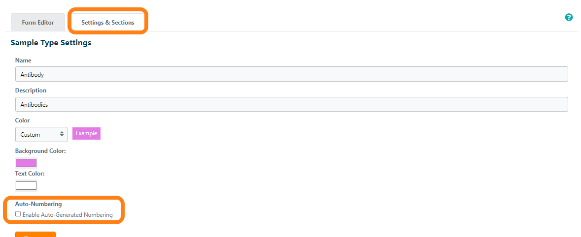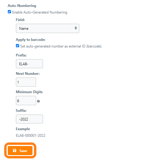eLabInventory allows users set up auto-incrementing fields when creating new samples of a particular sample type. Navigate to the Sample Types page under the Configuration tab and click the Edit icon of the sample type for which you want to enable auto numbering. Check the option Auto-numbering under Settings & Sections to enable auto-numbering for samples.