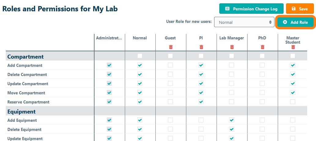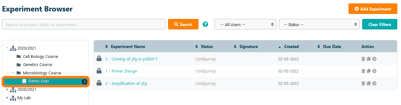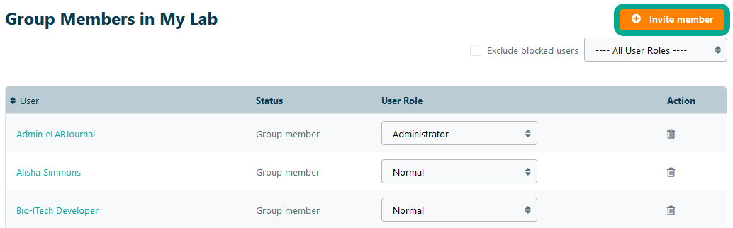 Note: depending on the number of teachers involved in a course, we do not recommend to give all teachers the administrator role. Rather, you should limit the number of administrators to just 1 or 2 individuals who will fully manage the system. Students should only be able to view and edit their own experiments (i.e. experiments where they are designated as a collaborator in the ELN).
