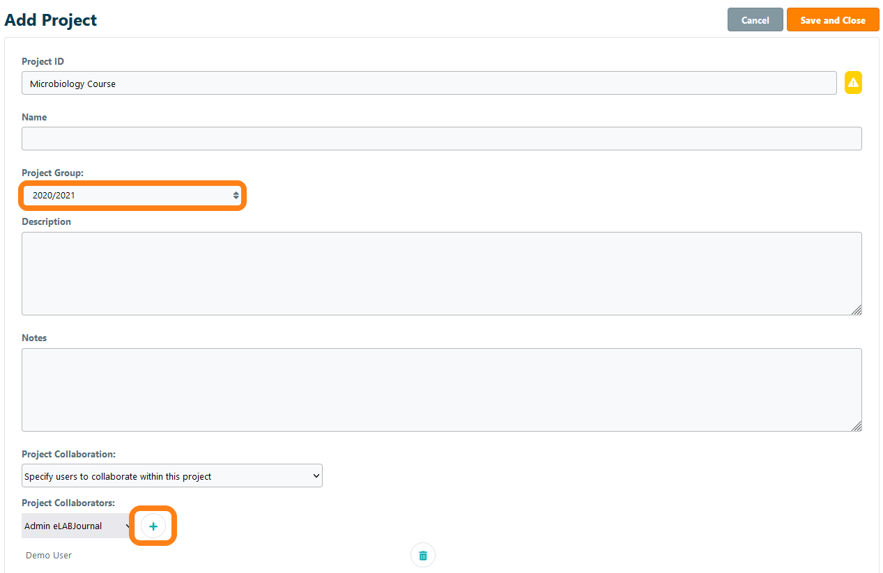 To arrange and document courses in the system, we recommend defining a course as a project. When you create a project within a project group (according to step 4), you automatically have the option to add the course to the corresponding year and assign teachers as collaborators to that project. Teachers designated as collaborators at the course-level will automatically be added as a collaborator to all subsequent experiments. Note: adding the teacher as a collaborator in a course is required if the system is configured to prevent teachers from viewing notebooks in other courses. If teachers are permitted to view ALL experiments, then this setting is not required but it has to be made sure that the courses are listed in the Experiment Browser under the teacher name. For understanding how accessing experiments is organized, please read the in-depth documentation about experiment collaboration .