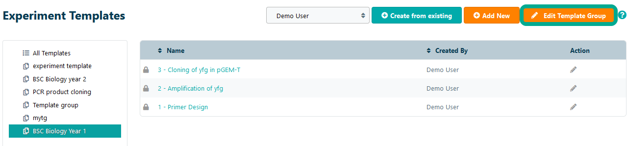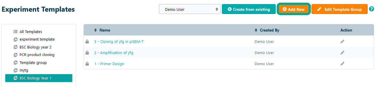 To organize the course in the most efficient manner, it is recommended to create experiment templates. In an experiment template you can add all relevant sections with instructions, protocols, samples and consumables that are needed and also define the sections in which data needs to be collected by the student. In this way, students can add an experiment and choose the corresponding experiment template they need to do on that day from a list of experiment templates. When creating an experiment template, it is recommended to label the templates in a way that students can easily find the one they have to carry out. Make sure that the created experiment templates are shared so that they are available for students when adding an experiment from an experiment template.