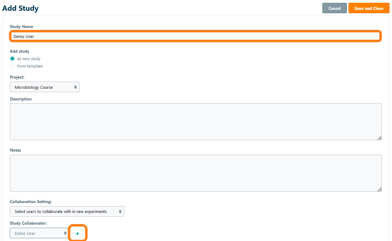 Once the students are signed up as active users in the system, you can set up their lab notebooks for each course. It is recommended to create a study for each student or workgroup (in case several students work together) to track and document results in a lab notebook. Use the name of the student(s) as the study name and make sure that the students are set as the study collaborator in the system. Also, include the teacher as the collaborator on the study level to make sure that experiments can be accessed by the teacher in all cases as the collaboration setting for the study overrules the collaborator setting of the project. To understand how study collaboration works, please read the relevant documentation about study collaboration. In case you have grouped experiment templates to a study template, you can choose the study from the corresponding template. In that way, all experiment templates in that study template will be added automatically to student's digital lab notebook.