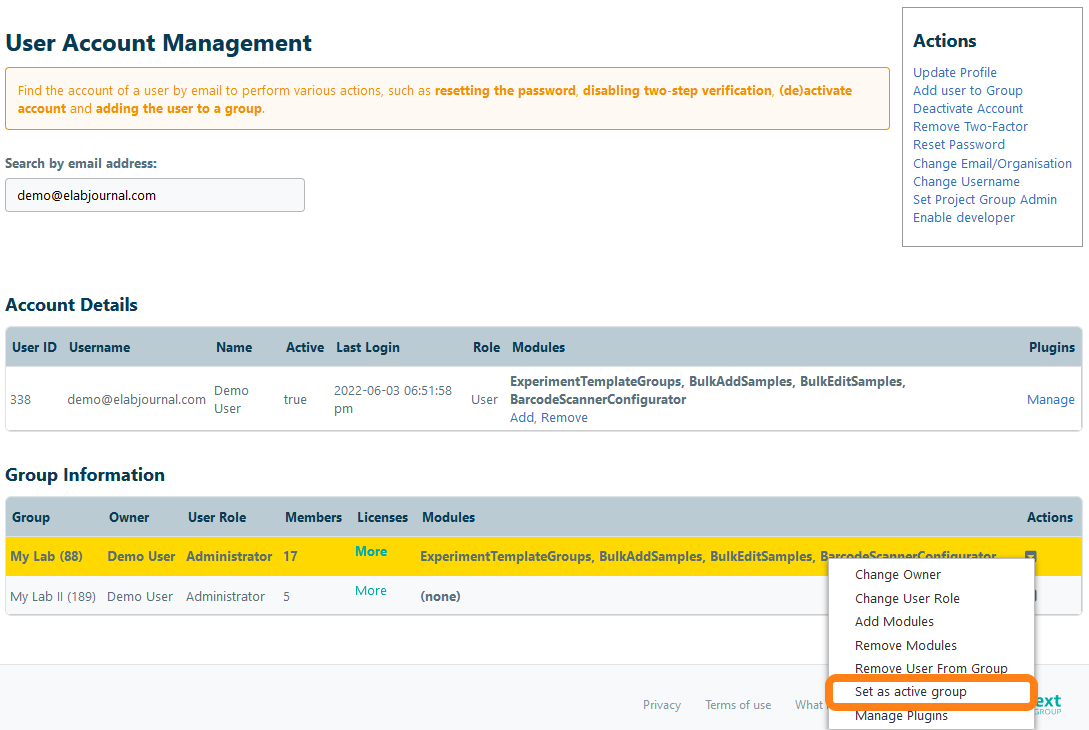 To change the active group for a user thereby changing the group where the user is working in, navigate to Accounts in the System Admin Panel panel and open Mange Accounts. Find the current group using the email address. Open the actions menu of the group and choose Set as active group