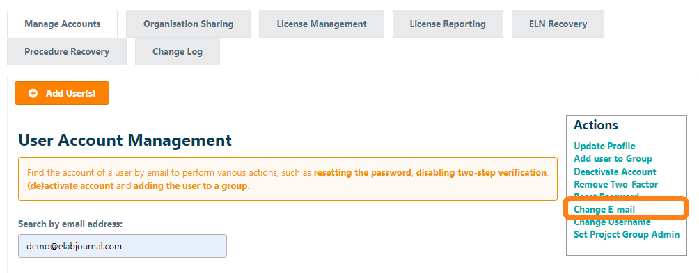 To change the email address for an account, navigate to Manage Accounts in the Organisation Admin panel. Find the account by entering the email address and click Change E-mail.