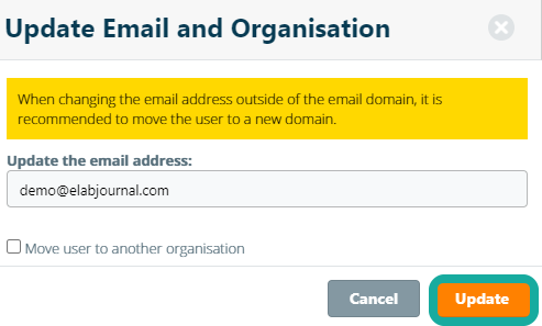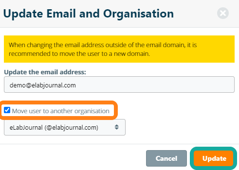 Important: since the email domain and the organisation are linked, we recommend to also update the organisation when changing the domain in the email address of a user. This ensures that users are correctly mapped within an organisation and prevents issues when organisation-wide policies or settings should be enforced. Select the option move user to another organisation to select the organisation to which a user should be moved.