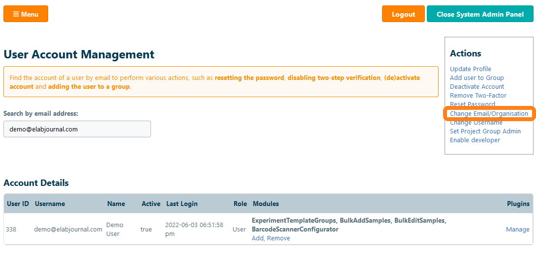 To change the email address for an account, navigate to Manage Accounts in the System Admin Panel. Find the account by entering the email address and click Change E-mail.