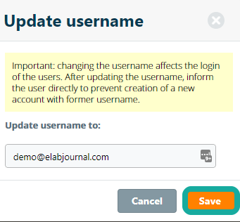 Please be aware that changing the username in the system has major consequences. To avoid confusion for a user during the login (i.e. forgot the username), the default setting of the system is that during the account set-up or account registration, the username is set to the user email address. In case the organisation login with AD/LDAP/ADFS/SSO is used, the username and email address are automatically set and updated during each login procedure. In case of a user or federated login, the username should never be updated