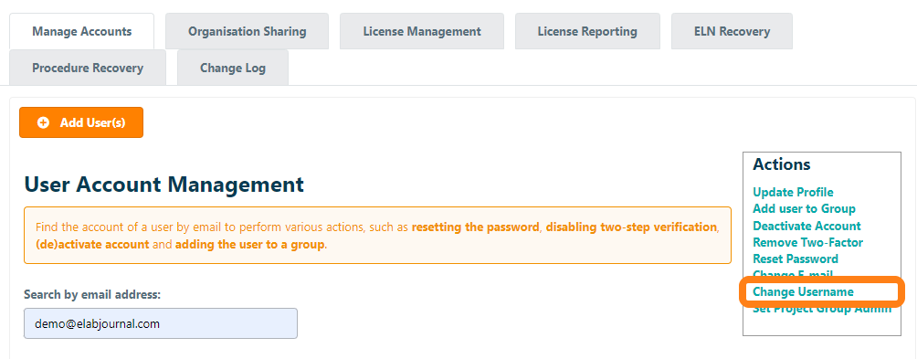 To change the user name for an account, navigate to Manage Accounts in the Organisation Admin panel. Find the account by entering the email address and click Change Username.