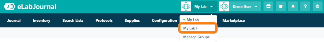 If you are a member of multiple groups, you need to change your active group setting in order access and work with another group's data. Navigate to My Groups and change the active group in the group drop-down menu. After changing this setting, you can directly access selected lab's projects, studies, experiments, inventory and procedures using the navigation menu.