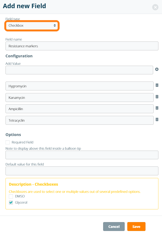 To add a multi-choice field with fixed options displayed as checkboxes, choose Checkbox from the Field type dropdown. You can add new checkbox options by entering the value in the Add Value field and clicking the Plus icon; to remove existing options, click the Remove icon next to the value field.