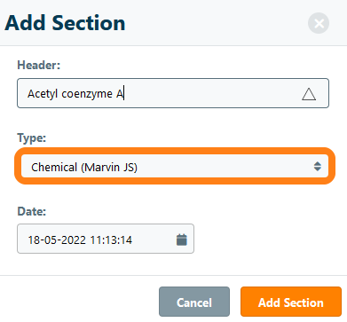 eLabJournal supports a seamless integration of the ChemAxon Marvin JS chemical editor to draw chemical structures and reactions within the ELN. To create a chemical section, add a new section and choose the Chemical (Marvin JS) type. Note: the use of the chemical section is an add-on that requires an additional license fee. Please contact us for more information.