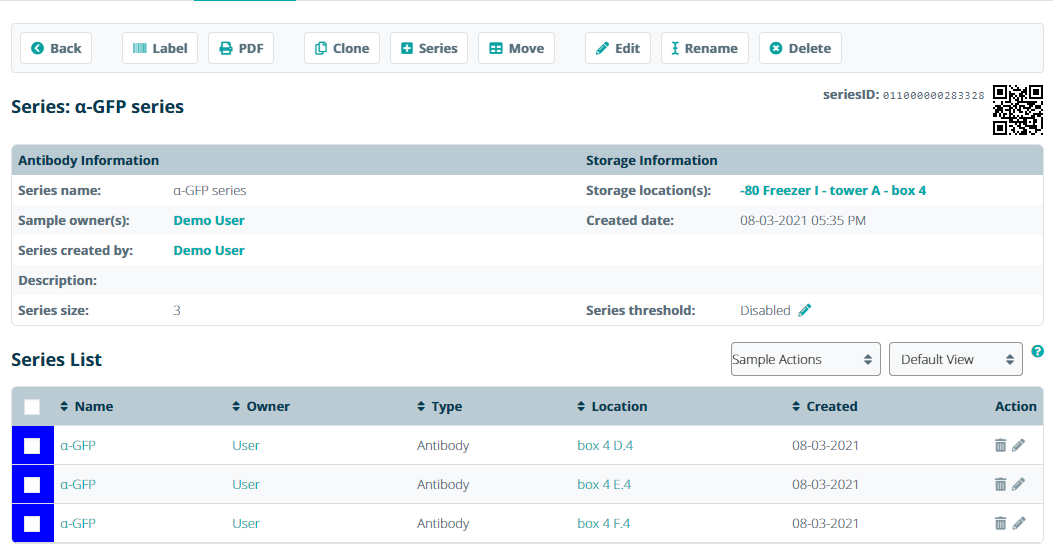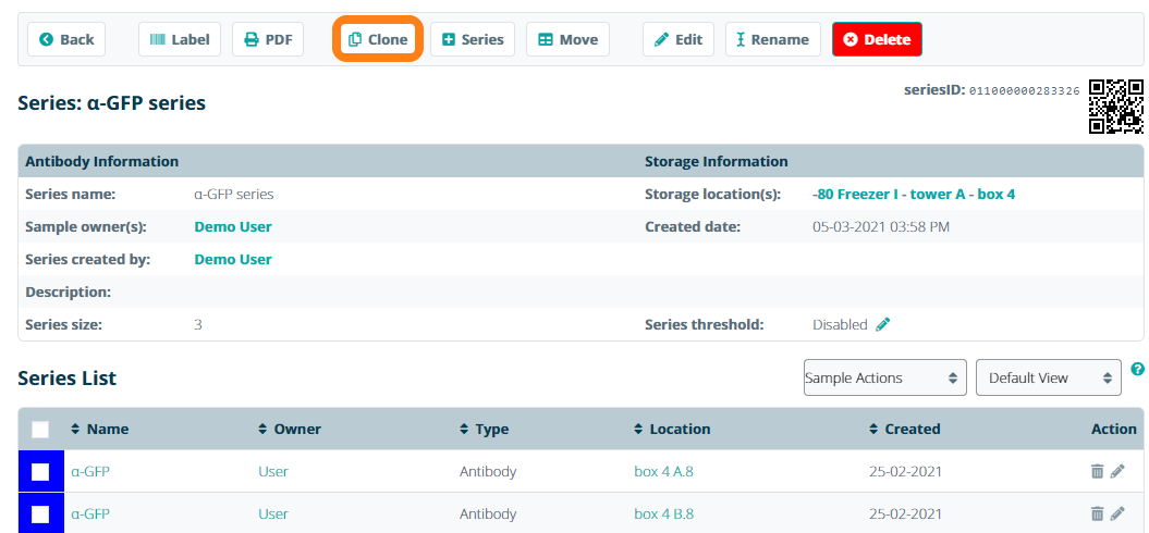 To duplicate a sample that is part of a series, navigate to the series information sheet and click the sample link in the sample list. Click Clone on the sample's information sheet select the Clone Setting to Clone as single samples. Note that it is currently not possible to add a cloned sample directly to a new series. Cloned samples should first be created before being added to an existing series.