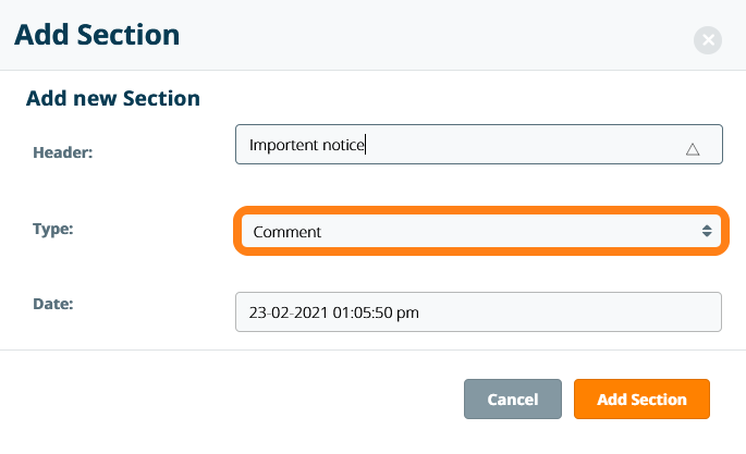 If you want to include a section that is highlighted in the ELN, click Add Section and select the Comment type.