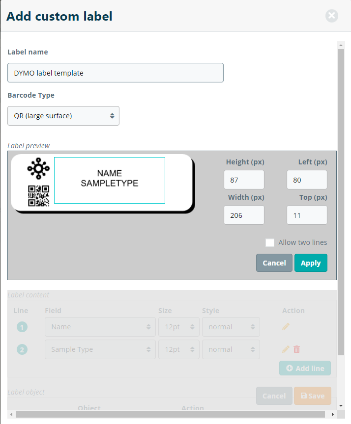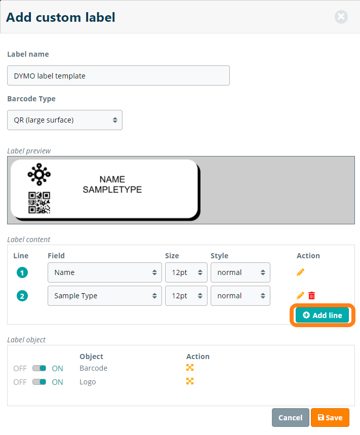 In this step, you can further configure the label template adding the lines to the label templates and selecting the barcode type. For printing barcodes on larger labels we recommend QR and for printing labels on smaller surfaces, we recommend DataMatrix as the Barcode Type.