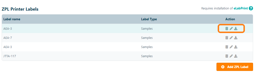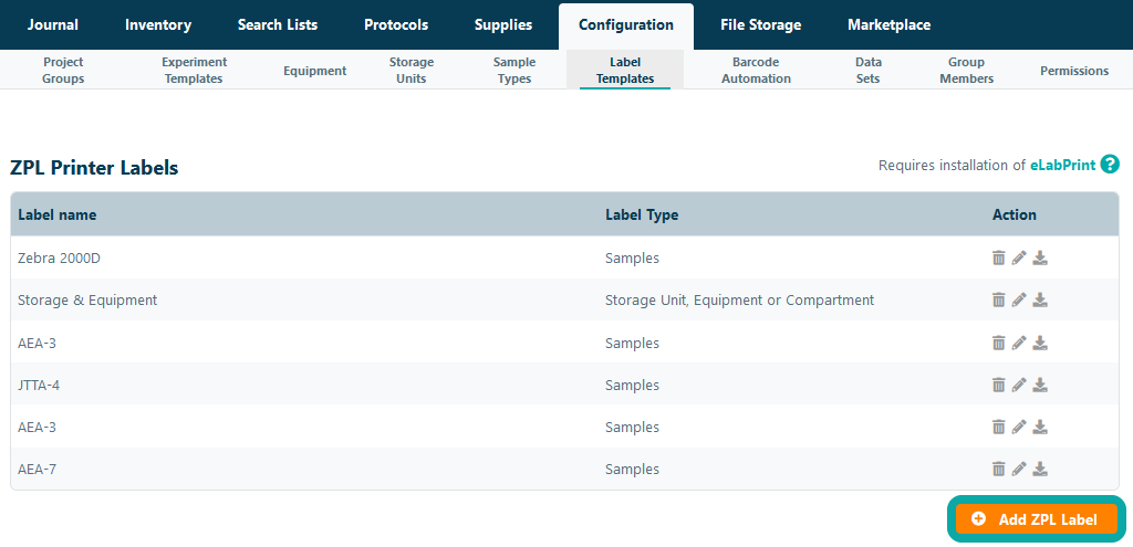 To print labels using a Zebra© Label Writer, you should first configure a so-called ZPL (Zebra Programming Language) label template. Open Print Label Templates in the Configuration menu and click Add ZPL Label. Note that you should first follow the ZPL label printer installation instructions and activate the ZPL label print option in eLabJournal to configure a ZPL label. When creating labels, separate label templates should be created for samples, sample series, and storage units, equipment or compartments.