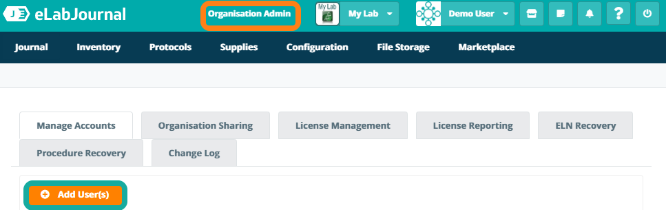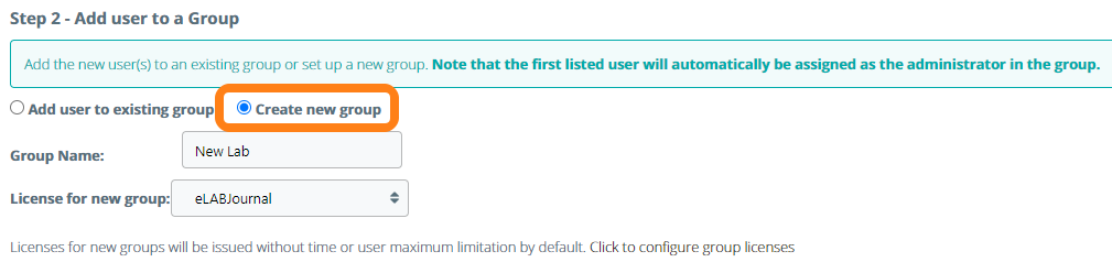 - Create new group – Choose if the created group license should be for eLabJournal or eLabInventory
