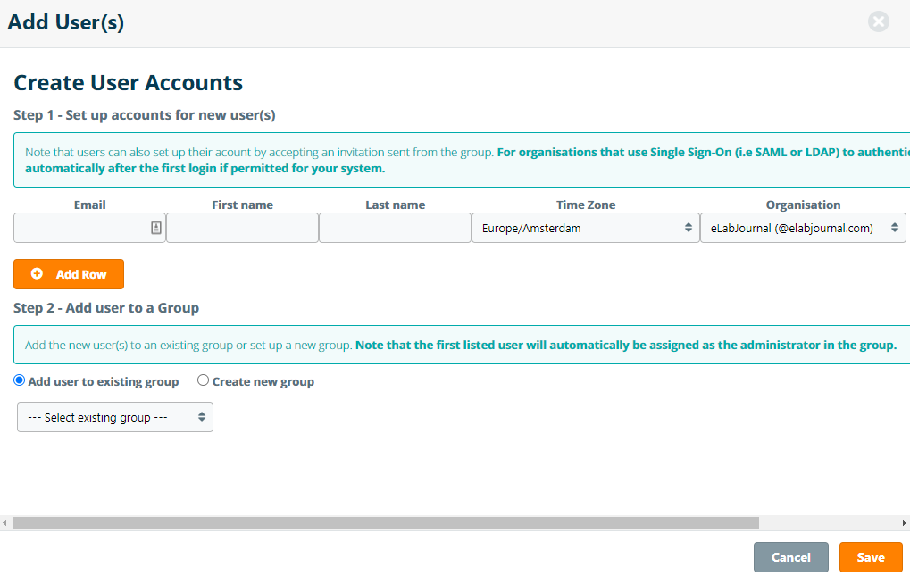 Click Add Row to create multiple accounts for users (only in case all these users need to be added to the same group).