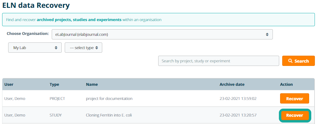 In the System Admin Panel, you can recover archived Projects, Studies, Experiments or Project Groups. Open Data Recovery in the System Admin Panel, open ELN Recovery then select the organisation and group.