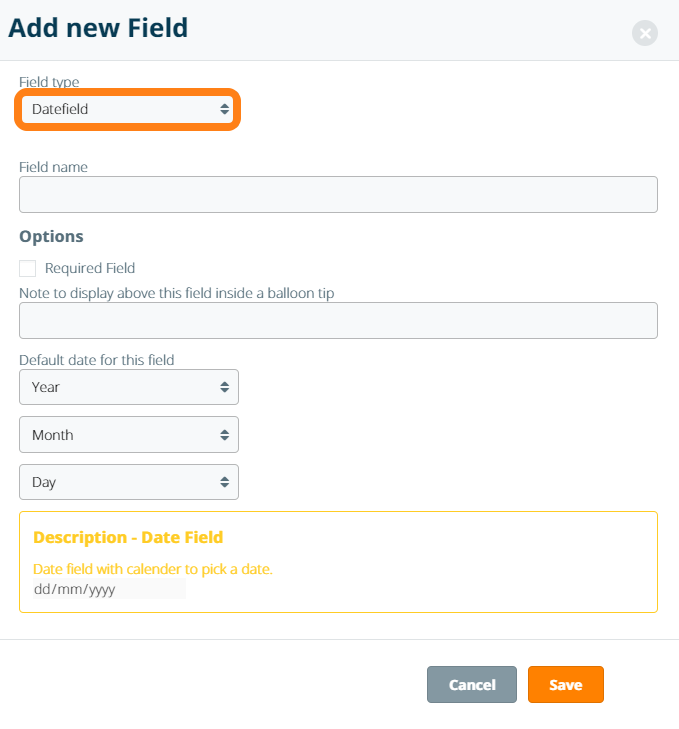 To add a field that allows you to select a date, choose Date Field from the Field type dropdown.
