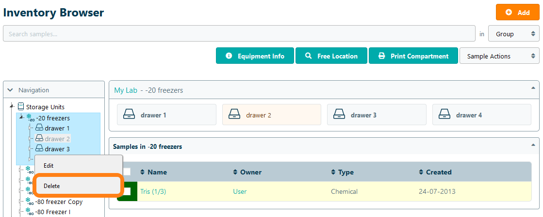 Confirm the deletion of the compartment by clicking Delete. In case the compartment you want to delete contains samples, the samples that are present in the box will be moved to the upper storage compartment from where they can be transferred to another compartment if needed. Note that the deletion of a compartment cannot be restored.