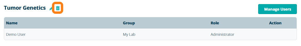 Before a project group can be deleted, all projects, studies, and experiments must be moved or removed from the project group. Once the project group is empty, a project group administrator may archive the project group by clicking the Delete icon.