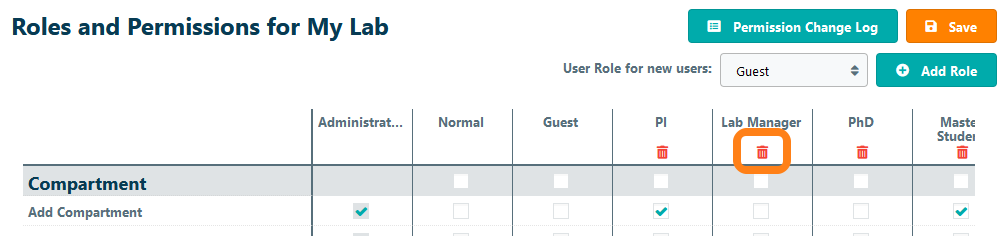 To delete a role, go to Configuration – Permissions and click on the Delete icon of the role you want to remove. Note: you cannot delete the administrator role, the normal user role, or a role that is either currently assigned to one of the lab members or set as the default user role.