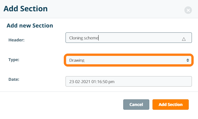 To make a drawing in the ELN, click Add Section and select the Drawing type.